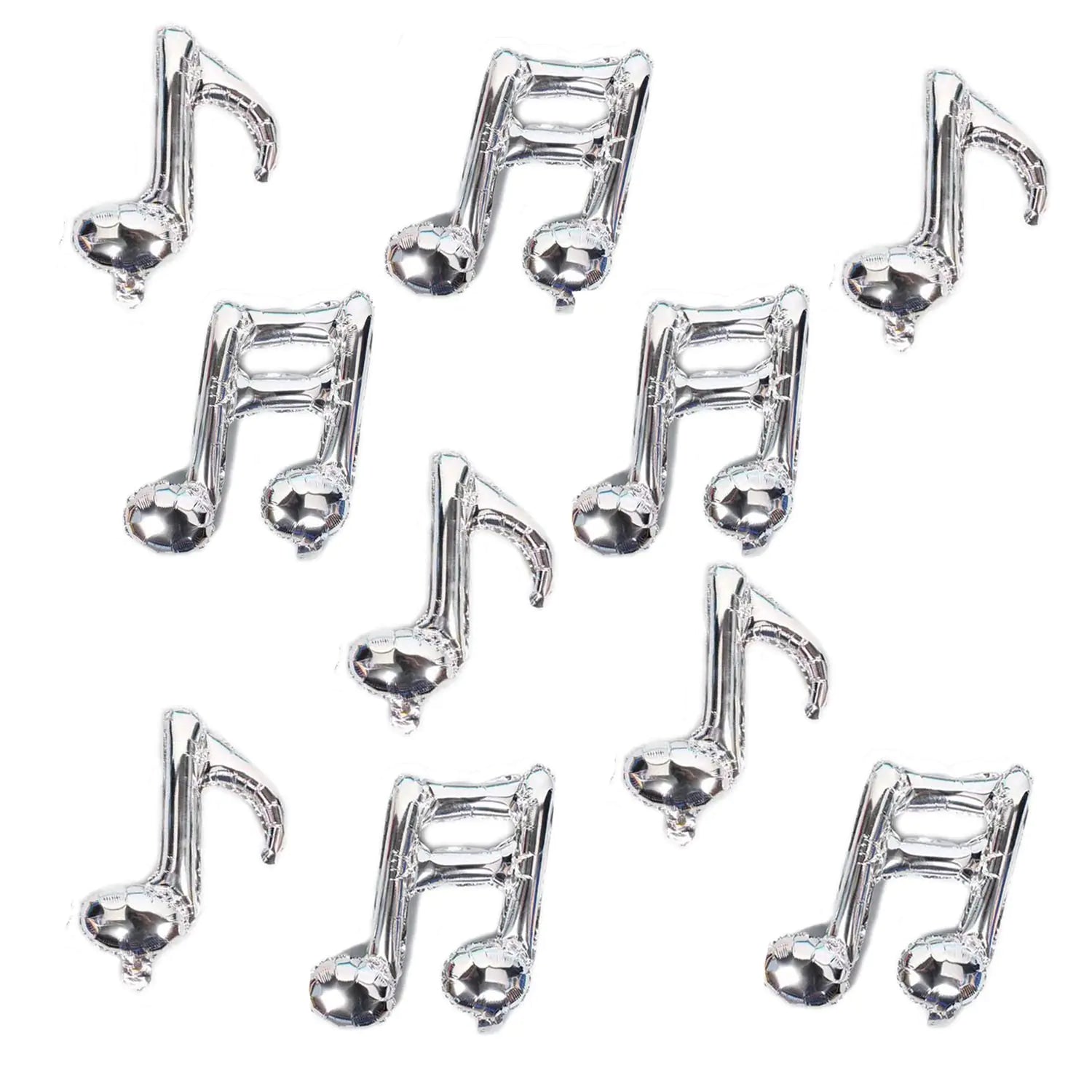 Delight in every moment with the 'Melodic Moments 10-Pc Silvery Mylar Balloon Set'. This dazzling set includes 5 single music note balloons and 5 double music notes, all crafted from shimmering silvery Mylar material to brighten any gathering. Set includes: